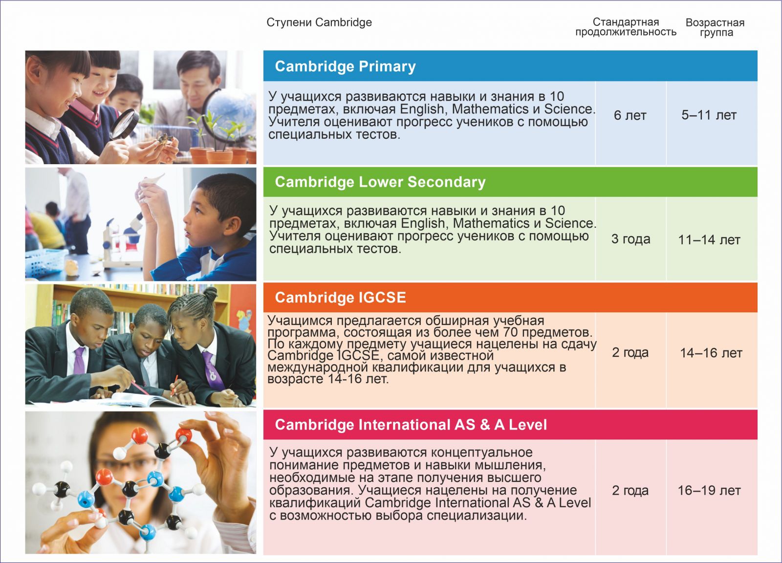 Программа Cambridge Assessment International Education разработана с учетом мировых стандартов образования и ориентирована на развитие критического мышления, исследовательских навыков и концептуального понимания предметов. Программа Cambridge представляет собой ступенчатый путь, состоящий из нескольких уровней. Учебная программа на каждом из уровней имеет свои цели и задачи.