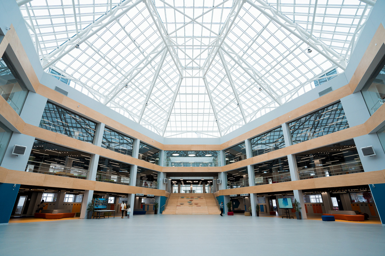 Үлкен шыны атриум күндізгі жарықта ұзақ уақыт бойы табиғи жарықпен қамтамасыз етеді. Мөлдір шатырдың арқасында мектеп кең және қолайлы. Шын мәнінде, ғимаратты жобалау кезінде басында бірден балалардың кем дегенде 8 сағат күні бойы мектепте болатындығы ескерілді. Атриумның бұл масштабы жайлылық сезімін сақтауға және қысым қабырғалары мен төбелерінен аулақ болуға мүмкіндік береді.